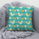 Colorful Mexican folk art style throw pillow pattern features white birds and other traditional elements on turquoise background