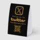 This elegant table tent sign features a bold gold "X" logo and "Follow Us On Twitter" text in a stylish gold font against a sleek black background. It also includes a prominent QR code, making it easy for customers to connect with your business on Twitter. Personalize it with your business name to create a cohesive brand experience. Perfect for restaurants, cafes, and retail spaces, this sign encourages social media engagement and expands your online reach. Its unique design is sure to catch the eye and prompt action from your patrons, enhancing your business's social media presence.
