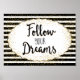 Gold and brown confetti make a festive and fun "Follow your Dreams" poster. Black and white striped background gives a great visual interest. Great for the graduates or other special occasion. Bold, fresh design will be perfect for your event.