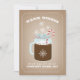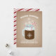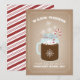A Christmas card featuring an illustration of a mason jar of hot chocolate garnished with a candy cane and snowflakes. Background on front is card stock inspired. Background on reverse is red and white candy cane stripes. Personalize the text.
