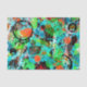 A lively abstract in shades of turquoise, teal, orange, red orange, black, white, metallic gold and shades of green.