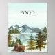For the Food table at your baby shower. This design has rustic, watercolor mountains with reflecting lake in front, and pine trees surrounding the lake. Adult bear with her cub in front. “Food” text at top.