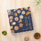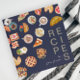 Collect all your favorite recipes in this unique binder. A design featuring a collection of illustrated dishes and a modern font with the word RECIPES over a dark blue background with an Grayish spine, personalize with your name or family name.