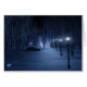 A snow-covered path meandering through the birch forest on a dark winter night. The way is lined with lampposts giving off a silvery blue glow, but in the shadows are bright, mesmerizing shapes like little fairy lights, luring the traveler off the trail. In the distance the lavender glow of some mysterious forest gathering lights up the cold sky.