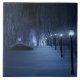 A snow-covered path meandering through the birch forest on a dark winter night. The way is lined with lampposts giving off a silvery blue glow, but in the shadows are bright, mesmerizing shapes like little fairy lights, luring the traveler off the trail. In the distance the lavender glow of some mysterious forest gathering lights up the cold sky.