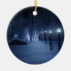 A snow-covered path meandering through the birch forest on a dark winter night. The way is lined with lampposts giving off a silvery blue glow, but in the shadows are bright, mesmerizing shapes like little fairy lights, luring the traveler off the trail. In the distance the lavender glow of some mysterious forest gathering lights up the cold sky.