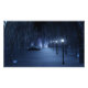 A snow-covered path meandering through the birch forest on a dark winter night. The way is lined with lampposts giving off a silvery blue glow, but in the shadows are bright, mesmerizing shapes like little fairy lights, luring the traveler off the trail. In the distance the lavender glow of some mysterious forest gathering lights up the cold sky.