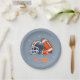 Football Ball Helmet Cartoon Birthday Party Paper Plates. Fun and modern football birthday plates with a custom name. Featuring a bold cartoon illustration of a football and helmet in orange and grey. Add your name.