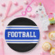 This sporty, athletic design features bold FOOTBALL text inside a highlighted wide bright blue stripe with white stripes against a black background. The text can be personalized.