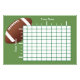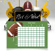 Football game board poster. Team name templates created for you. Ten rows and ten columns for numbers 0 through 9, chosen randomly for each column and row**. It is important that after all the squares are filled in with your guests initials that the numbers for each row and column is chosen randomly. Each space is for your guests initials. Large American football in upper left side on green background. Game is usually played with players paying for each square for the pool money or just for prizes provided by host. Winners are determined by last digit of score, and can be played after each quarter of game (4 winners), or half time (2 winners) or winner take all (1 winner) at end of game. For example: Team 1 has 18 points, Team 2 has 27 points....Winner would be found in row 8, column 7.