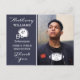 Football star graduate photo graduation "Thank You" with the football and the helmet in blue and white. Design features photo on the right with details on the left. A football is overlaid by your graduation year over the bottom of your photo. The left side features your first and last names on top in two different fonts, with your player number over the helmet below that followed by your player position, your school, and the words "Thank You". The back features your unique message of thanks, your closing and typed signature. Original design by Holiday Hearts Designs (all rights reserved). Template placeholder photo credit to Steven Jones via Unsplash.