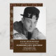 Sports theme teen boy graduation photo announcement and open house. Brown with white text and a big photo template area. His name, school, and class are printed beneath the photo along with the celebration information. A pattern of footballs and baseballs cover the back of the paper.