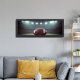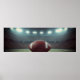 A dramatic panoramic photograph of a football field under bright stadium floodlights at night, the green turf glowing against a moody blue sky. This wide-format sports image brings the energy of game night into any teen bedroom, game room, or football fan's hangout space.