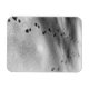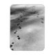 A dusting of fresh snow covers a black driveway with varying densities. Two sets of black boot prints start side by side at the top of the image and diverge as they approach the viewer in this vertical, black and white photograph. One set of tracks heads out the bottom left corner while the other set of footprints exits halfway down the right side of the frame.