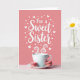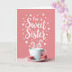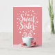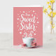 This greeting card has a soft coral-pink background that feels warm and caring right away. Near the top, the words “For a Sweet Sister” appear in white, flowing cursive-style lettering, centered and easy to read. Small white hearts float all around the message, scattered in different sizes like they’re drifting through the air. Below the text sits a white teacup on a matching saucer, drawn with simple, cozy details. Curled white steam rises from the cup and forms the number “28” before fading into more hearts. Two pink macarons with a light golden filling rest on the saucer beside the cup, adding a sweet treat feeling to the scene. It’s a thoughtful way to mark a special age while showing love and closeness for a sister 🥰❤️. Hope it helps you share your Valentine’s Day sentiments in a warm, caring way.