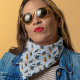 This patterned bandana is perfect for bird lovers. It features illustrations of kingfishers in blue, mustard gold and white set against a patterned light blue background.