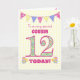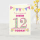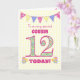 A pretty 12th Birthday card for your cousin, with polka dot bunting, primrose flowers and numbers filled with a primrose pattern, all on a pale yellow check gingham background. The front cover message is, 'To a very special COUSIN 12 TODAY!' The inside message is just a suggestion and you can easily personalize it or delete it if you prefer.
