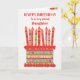 You can add the age to this brightly colored birthday card for your daughter, with a strawberry birthday cake. The cake has lots of candles with different patterns and there is a patterned band around the cake with colorful summer fruits - strawberries, raspberries, limes and orange slices. Above the cake, the greeting, in red lettering, is 'HAPPY BIRTHDAY to a very special Daughter' and on the cake there is a space for you to add the age, followed by 'years old today!' in white lettering. Please feel free to customize the inside message if you wish; you can change the font and the color as well as the message.