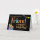 A bright and colorful Birthday card for a Friend of any age, with Birthday Cake Candles, Bunting and Stars and the word, 'Friend' in patterned lettering, outlined in gold-effect (not metallic ink) and Happy Birthday, also in gold-effect, all on a black background. A digital design by Judy Adamson.
