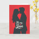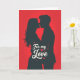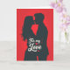 This Valentine's Day card shows a couple kissing in the center, shown as dark silhouettes with their faces close and bodies gently leaning into each other. The background is a deep red, which makes the scene feel warm and romantic right away ❤️. Because the figures don’t show detailed features, it’s easy to imagine the couple as anyone you care about, which makes it feel more personal. Beneath the kiss, the words “For my Love” appear in white, written in a flowing cursive style and placed near the bottom of the card. Small red hearts are sprinkled around the words and near the couple, with some filled in and some drawn as outlines, adding a sweet touch without crowding the design. The simple layout keeps your attention on the closeness of the kiss and the message underneath. It’s a meaningful card to give when you want to say “I’m with you” in a quiet, direct way 🥰.