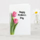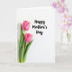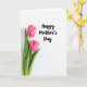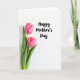 This card shows a simple white background with two closed pink flower buds rising along the left side, like a quiet pair leaning toward each other ❤️. Each bud sits on a sturdy green stem, and long smooth leaves stretch outward as if offering a gentle embrace. The soft pink petals look velvety, while the greenery has a fresh sheen that adds contrast without feeling busy. In the upper right area, a short Mother’s Day message appears in a dark, easy-to-read cursive-style font, leaving plenty of open space around it 🌼. The wide spacing makes the flowers and words feel connected, like a tender note shared across a calm room. Light falls evenly across the scene, creating faint shadows that give the stems and leaves a little depth. Two unopened buds stand in the left third of the card, with the dark message placed high on the right against the white field.
