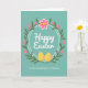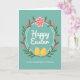 This card features a muted teal-green background that sets a calm spring setting, with a double-lined white oval centered like a gentle frame for a close, friendly message. Around the oval sits a leafy wreath in soft olive green, dotted with pink tulips and small blossoms that feel like a bouquet offered with care 🌷. At the top of the wreath, a five-petaled deep pink flower with a bright yellow center draws the eye, like a cheerful nod from one person to another. Inside the oval, the words “Happy Easter” appear in white, flowing lettering placed across the middle, standing out clearly against the teal. Just below the greeting, two golden-yellow egg shapes rest side by side, suggesting a shared tradition and an easy, warm connection 🐰. Near the bottom, the line “TO MY WONDERFUL TEACHER” is set in white, all-cap letters in a simple, easy-to-read style, centered and neatly spaced. Pink tulips flank the oval while the yellow eggs sit beneath the white greeting on the teal field.