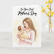 This card features a gentle illustration of a woman cradling an infant close to her chest, their faces angled toward each other in a quiet, affectionate moment ❤️. Her long light-brown hair falls softly as she tilts her head down with closed eyes and a small, caring smile. She wears a simple light-pink long-sleeved top that keeps the scene calm and tender. The baby is wrapped snugly in a muted yellow-ochre blanket, looking up toward her as if drawn in by her warmth. Behind them, a creamy pale-yellow wash creates a soft, airy setting that keeps the focus on their closeness and the loving connection between them. Near the top of the card, the message “On Your First Mother’s Day” is placed above the illustration in dark lettering, standing out clearly against the light background 🌼. The background shows a pale yellow watercolor-like wash with no other objects or scenery.