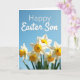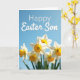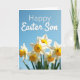 Designed with a close-up view of trumpet-shaped spring flowers, this card shows white petals opening around warm yellow-orange centers, like friends leaning in for a gentle hello 🌷. Shot from a low angle, the blooms rise upward into a wide, clear blue sky that fills most of the top half. Bright sunlight highlights the petal edges and the softly rippled rim inside each trumpet, adding a tender, welcoming softness to the scene. The nearest blossoms are sharply detailed while the flowers behind them fade into a blur, giving the foreground a cozy, intimate focus. Near the upper area, a short message appears in thin white lettering that stands out lightly against the blue background without overpowering the flowers. The cool sky and the glowing orange-yellow centers balance each other, creating a calm, affectionate contrast that feels like a quiet shared moment 🐰. The white text sits above the flower cluster, centered slightly to the right, with the crisp letters floating over the open blue space.