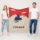 Create a personalized gift for your favorite snowmobiler. It's perfect for warming up after a chilly day out snowmobiling. This custom fleece blanket has a vintage style illustration of a snowmobile and rider in navy blue set against a backdrop of cream or ivory colored mountains against a red background. It's ready to be personalized with a name in navy blue colored lettering.