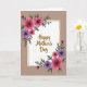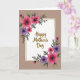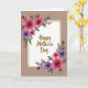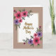 This greeting card features a white rectangular panel with lightly textured edges, outlined by a thin, shimmering gold line that feels like a gentle embrace ❤️. Behind it sits a warm, muted taupe background that keeps the focus on the center. In the middle of the white panel, a celebratory message appears in flowing gold lettering, set to stand out without crowding the artwork. Floral clusters decorate two opposite corners, with rich fuchsia and deep purple blooms that resemble anemone-like flowers, their dark centers giving them a tender, intimate look. Slender green leaves and airy sprigs curl outward from the corners, as if the flowers are leaning in toward the message like close friends 🌼. The blossoms vary in size from large, open petals to smaller buds, creating a soft sense of movement around the panel. The gold outline catches the light subtly, while the corner flowers spill diagonally across the white space from top-left and bottom-right.