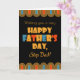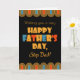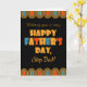 A stylish Father's Day greeting card for your stepdad, in an Art Deco style. The front cover greeting is, 'Wishing you a very HAPPY FATHER'S DAY, Step Dad!' in bright red, blue and golden yellow on a black background. There are curved Art Deco patterns at the top and bottom and the inside message is just a suggestion which you can easily change or delete altogether if you wish.