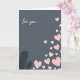 This design shows a deep slate-gray background with the phrase “for you..” placed in the upper left in a soft ivory color, like a gentle note meant for someone close 🥰. Along the right side and curling into the lower edge, a trail of heart shapes drifts downward in pastel pink and creamy beige, suggesting a quiet exchange of affection ❤️. Each heart has a faint shadow that makes it look slightly raised, as if it were carefully set on the surface. The spacing and mix of sizes feel naturally scattered, like little tokens dropped one by one as the eye travels across the card. The lighting stays even and calm, helping the hearts’ edges and shadows stand out against the dark background. In the bottom left corner, a dark, organic shape appears—almost like the tip of a rabbit ear or a soft leaf—adding a small, mysterious accent. The hearts cluster most densely near the right edge and lower border, with a few hovering closer to the center for balance.