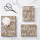 A romantic wrapping paper featuring a rustic kraft background with an elegant romantic handwritten font, with a message on three separate sheets of paper, that read, "for you" on one, "my love" on the other, "and joy" on the third, so as to read in one sentence: "for you my love and joy." (The sayings are customizable) Add red plaid ribbon to your wrapped gift with an real pine or cedar sprig, and nothing could be more elegant, minimalist and romantic.