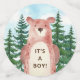 Cute baby boy design featuring a brown bear with a green spruce forest and watercolor blue sky. Easy to personalize with your information. Visit our shop to view our entire forest adventure bear collection.