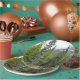 This paper plate design features a photo of a forest scene with coniferous trees, along with a mountain in the background.