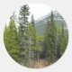 This round sticker design features a photo of a forest scene with coniferous trees, along with a mountain in the background.