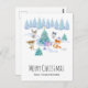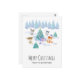 A Merry Christmas postcard with a whimsical Christmas scene. Happy forest animals dancing around a decorated Christmas tree. Festive holiday watercolor design.