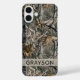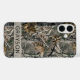 Customize this forest branches camouflage iPhone 16 plus case with your name in a trendy modern CAP font in gray on opaque cream. It's masculine and perfect for your favorite military, hunting, country or outdoorsman!