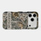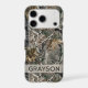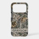 Customize this forest branches camouflage iPhone 17 pro case with your name in a trendy modern CAP font in gray on opaque cream. It's masculine and perfect for your favorite military, hunting, country or outdoorsman!