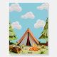 Greet your guests in rustic style with this Forest Camping Outdoors Birthday Party Welcome foam board sign! Featuring a charming 3D low poly outdoor scene, the design showcases an orange tent nestled between two pine trees, with a cozy campfire, glowing lantern, and a tree trunk holding a plate of s’mores and a marshmallow stick. The lush green ground is dotted with rocks, flowers, and butterflies, all under a bright blue sky with soft clouds.