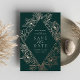 An elegant save the date design featuring your wedding details in chic off-white lettering, nestled in a diamond shaped geometric element. An intricate floral border of rose gold foil lilies and foliage pops against a deep forest green background.