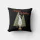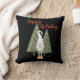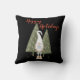 Make your home more festive for the holidays with this cute and elegant gnome throw pillow! Winter forest scene featuring a skinny-legged Scandinavian gnome holding a cute blue bird in front of pine trees. In pretty red typography is the quote "Happy Holidays". Black background.
