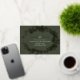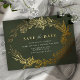 Formal save the date cards featuring real metallic foil. Vintage-style florals frame your details. Gold on a contrasting dark green background.