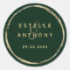 This wedding sticker features a faux gold circle frame with an elegant ampersand and simple calligraphy with a forest green background.