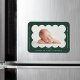 Modern birth announcement magnet featuring your baby's photo nestled inside of a forest green scalloped frame. Personalize the forest green birth announcement magnet by adding your baby's name and additional information in white lettering.