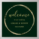 This wedding welcome sign features a faux gold circle frame with simple calligraphy with a forest green background.