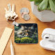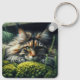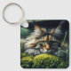 A majestic, long-haired cat with piercing green eyes lies nestled among lush forest moss, partially hidden beneath a wooden log. The lighting and textures give the image a mystical, almost enchanted feel, blending the cat seamlessly with its natural surroundings. A perfect balance of elegance, wilderness, and quiet watchfulness.