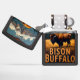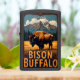 A powerful bison stands as a guardian of the forest and mountains in this unique illustration. The artwork is rendered in a tooled leather style, with deep, engraved lines giving it a rich, textured look. A large, glowing moon or sun shines on the horizon, casting an orange glow over the rugged terrain.
