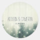 Rustic wedding envelope seal with spruce trees decorated with fairy lights.