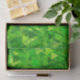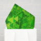 This design features an abstract pattern of many triangle shapes colored various shades of green. It could perhaps be said to resemble a dense forest of coniferous trees.